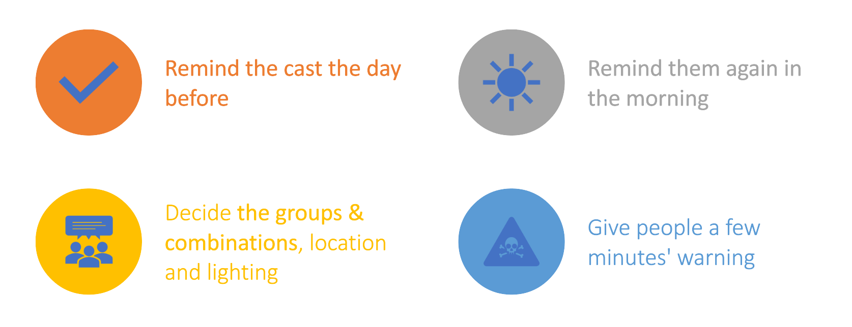 On the morning of the session, it is helpful to remind them again (e.g. “...and we will take some publicity photos of the cast together after lunch”).